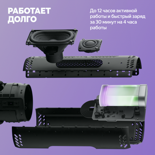 Не позволяйте размерам обмануть вас. Под стильным корпусом скрывается серьезная акустическая система: по 2 динамика и пассивных излучателя обеспечивают суммарную мощность 30 Вт. Это значит, что ваша музыка будет звучать объемно, насыщенно и детально — как дома на диване, так и на открытом воздухе.